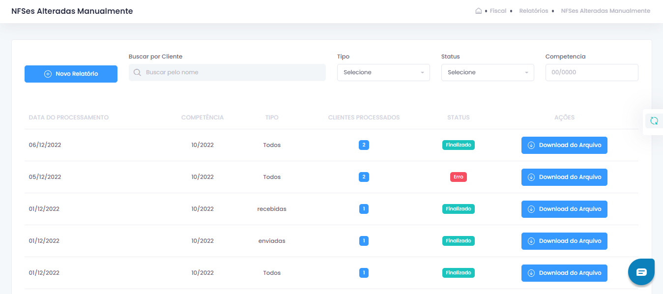 Ao clicar no menu, você será direcionado para a tela principal, onde são listados os relatórios que já foram gerados e informações como: competência, o tipo da NFS-e (emitida, recebida ou todas), qual cliente foi selecionado, o status de processamento do relatório, entre outros.