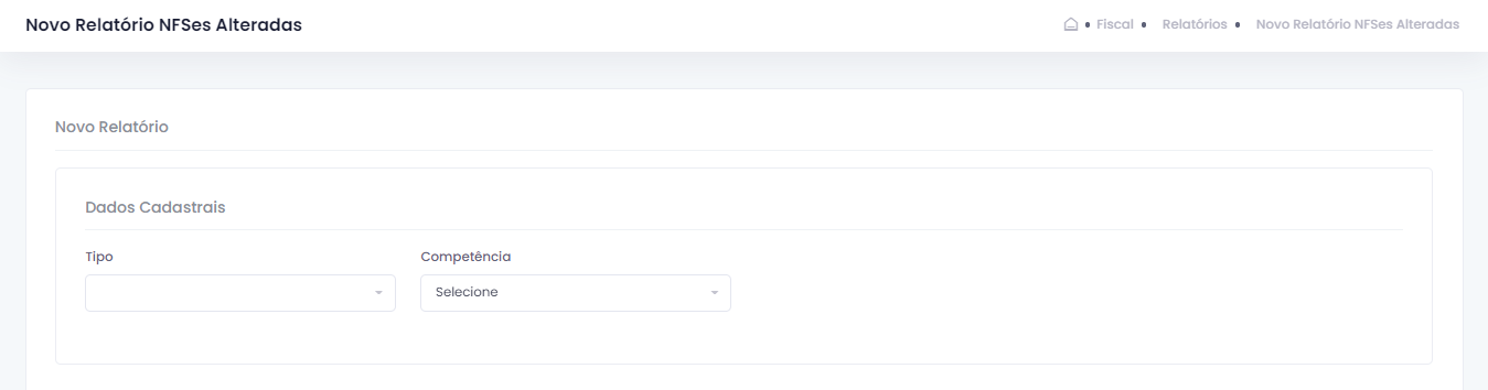 Ao clicar em "+ Novo Relatório", você será direcionado para a página de nova consulta, onde são feitas as seleções necessárias para a geração do arquivo.