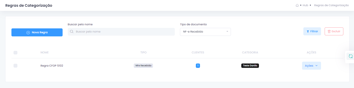 Depois que incluir todas as informações, clique em salvar regra e você será direcionado para a tela principal novamente, e sua nova regra já constará na listagem de regras. Na tela principal, também é possível realizar filtros a fim de encontrar alguma regra específica. Esses filtros são: buscar por nome, por tipo de documento, por NCM, por CFOP, por categoria e por fornecedor.
