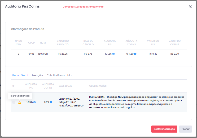 O sistema irá listar todas as regras mapeadas para o NCM em questão, é possível verificar o tipo de regra, a alíquota do PIS, alíquota do COFINS, a base legal e as observações dessa regra.