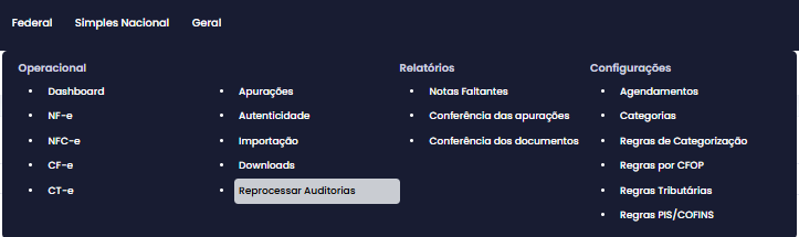 O primeiro passo é acessar o menu, que se encontra em: Federal > Reprocessar auditorias