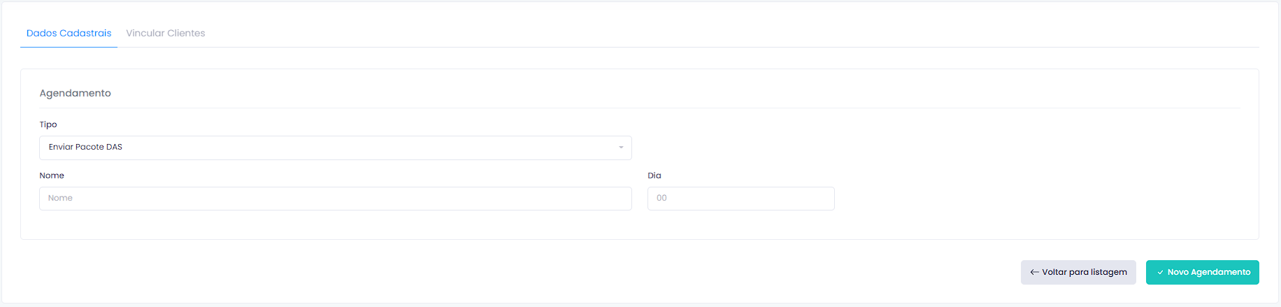 2 - Selecione o tipo Pacote DAS, digite um nome para o agendamento e selecione o dia para ser enviado