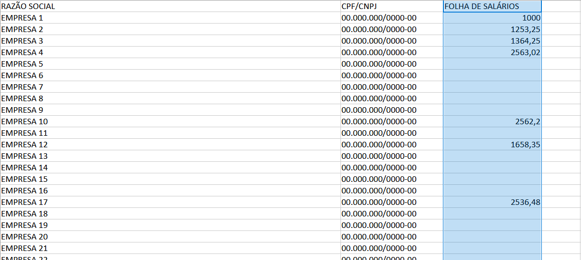 Após salvar a planilha, preencher os campo "Folha de Salários" com os valores de cada empresa e salvar o arquivo, basta seleciona-lo e clicar em "Importar folha salarial" para finalizar a importação.